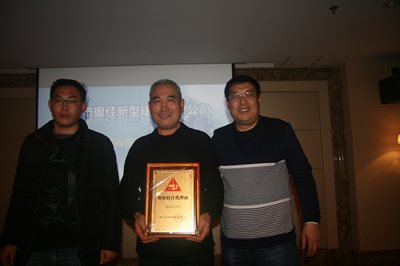 (图为甄永楷为河南区域刘总授牌,成为奥佳防水经销商大家庭的一员)