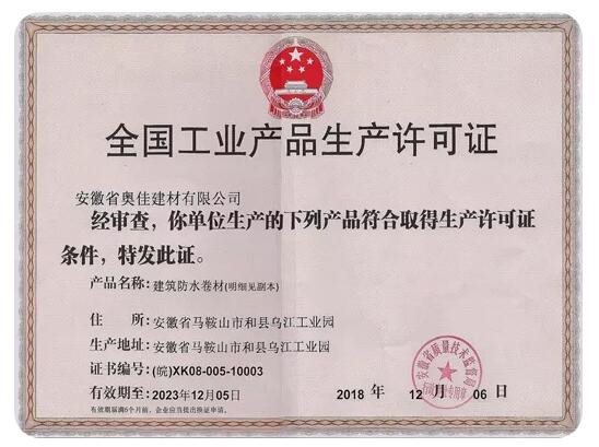 奥佳防水集团——安徽奥佳生产基地顺利通过《全国工业产品生产许可证》专家组现场查验。